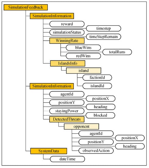 The architecture of the system used in this study is presented in Figure 1. We decouple the agents’ control from the main environment in order to allow different implementations of controllers. In this case, we consider the multi-agent simulation platform as a server, and any attached controller becomes a client. Each USV agent selects its action based on the observed information from the environment. Based on the data visualization model of the USV, the data collection platform forms and mounts the corresponding resource tree structure of the USV. Historical data are provided to the upper machine learning algorithm by the data collection platform after data fusion. The obtained algorithm controller is then loaded into the USV.