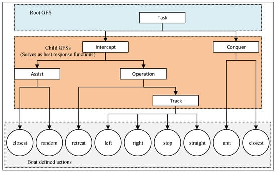 In order to provide a realistic virtual environment and opponent for the red force to train against, the blue force control algorithm uses human-defined rules. Table 1 shows an example encoding rules used for the blue force task selection during simulation. The GFT of the red force control algorithm is illustrated in Figure 8. The details of each of the GFSs of the GFT can also be seen in Table 2.