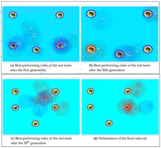 The observed simulation results of both teams during training are presented in Figure 10. As can be seen in Figure 10a,c, the blue force was performing better than the red force during the first generation of rules. However, after 10 and 13 generations, respectively, the red force began to outperform the blue force in the environment, and this is what caused the red force performance to rise in Figure 10a,c. In Figure 10b,d, we compare the highest score attained by both teams in each generation. Furthermore, the same analogy can be drawn from this graph, as in the the initial generations, the blue force seemed to be scoring high as compared to the counterpart red force.