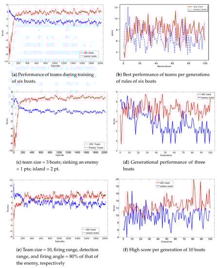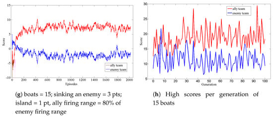 Finally, a simulation of 15 boats with the objective of destroying more opponent boats while still countering islands was conducted. To this end, we assigned three points for destroying opponent boats and a point for conquering an island. All other parameters were reset to the initial fixed parameters with the exception of the firing range, which was maintained as of the opponents’ firing range. The initial population of rules in this scenario was the final population rules’ set from the scenario. The performance graph is shown in Figure 10g,h.