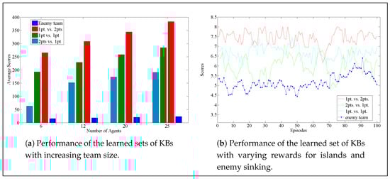 The observed performance of these KBs run over one hundred episodes against the enemy team is presented in Figure 11. The blue line in Figure 11a represents the best performance of the enemy team in the three cases against the ally team’s performances in all cases. In Figure 11b, the average scores over 100 episodes with increasing number of boats in a team is illustrated. The blue bar is the average scores of the the enemy teams, while the rest of the bars represent the performance of the ally team with varied team size and point allocation.