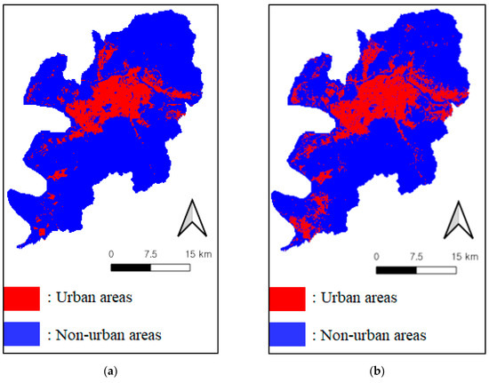 | Total Areas of the Urban Areas in the First Urban Map (km2) | Total Areas of the Urban Areas in the Second Urban Map (km2) | Increase of the Expanded Urban Areas in Daegu from 2007 to 2017 (km2) | |||||||||||