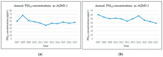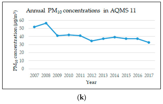 | AQMS ID | Maximum (μg/m³) | Minimum (μg/m³) | Average (μg/m³) | Standard Deviation | Variation of Annual PM10 Concentration (2017 vs 2007) (μg/m³) | ||||||||