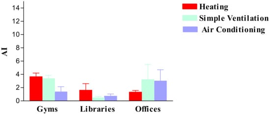 AI is determined by calculating the ratio between the GIMC/m3 values measured inside a building and those measured outside. This index is greater than 1 when the microbial contamination inside a building is higher than the outdoor contamination. In most cases, the values of microbial contamination of indoor air are higher than the outdoor values. In the heating phase, AI showed a worsening of air contamination especially in gyms compared the other environments considered (3.7). On the contrary, during the conditioning period, the highest values were recorded in offices (3.0) (Figure 1).