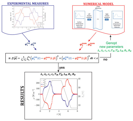 Given these two data, i.e., the experimental and numerical heat flow-rates, a criterion can be defined in order to assess the correctness of the estimation of , here thanks to the classic least-square error: