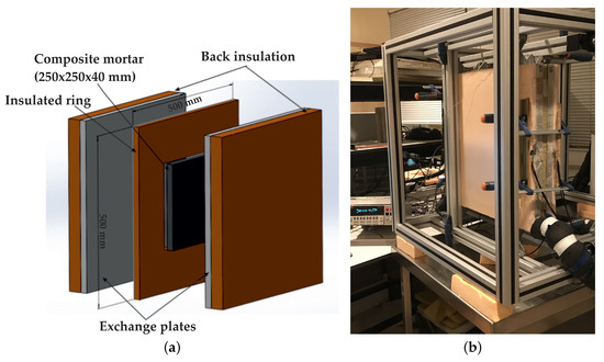 After the composite mortars have dried and hardened, the samples are placed in the experimental set-up, as depicted in Figure 2. First, the mortar is surrounded by an insulated ring. This ring avoids the heat losses by the lateral sides and enables 1D transfer towards the studied sample in the area of measures. On each face of the sample, a tangential gradient fluxmeter [69] with integrated thermocouples (T-type precalibrated at ) is stuck to limit the contact thermal resistance and measure both the heat flux and the temperature. Their dimensions are similar to those of the sample, which means that they are mm2. Practically, these are CAPTEC products, whose thicknesses are about 0.2 mm and sensitivity are . The calibration procedure, described in [69,70], permits us to calibrate these sensors with a precision of as demonstrated for the example in [71]. Secondly, the entire sample is positioned between two exchange plates in order to impose the temperature on the two main faces. The plates are held compressed against the sample by means of clamps, as shown in Figure 2b.