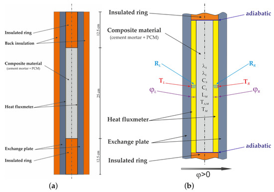 Thus, the objective of the present work is to propose a non-intrusive extended method to characterize all the thermo-physical properties of a composite material composed of a cement mortar integrating a micro-encapsulated PCM. The intrinsic features are two-fold. First, all the required parameters are obtained altogether. Then, the needed parameters to perform simulations with dedicated tools (as EnergyPlus or Modelica for instance) are directly provided. Further, a painstaking and exhaustive analysis is carried out to study the scedasticity of the identified parameters. The goal is to prove the robustness and reliability of the method. Practically, the paper is organized as follows. The basic principle of the method is given in Section 2. In summary, it is composed of an experimental part followed by an identification one. The former one, whose protocole is defined in Section 2.1, involves a full sample of the composite material, i.e., at a real scale. This latter one is then thermally stimulated, at different heating and cooling rates, and it undergoes several cycles for each heat stress. The next step, detailed in Section 2.2 and Section 2.3, relies on an inverse method, which uses a numerical modeling of the sample. The physical modeling is first presented, its specificity being to impose a thermodynamically consistent approach, and then the numerical method is detailed. Features of the inverse process are finally given. In plain language, it combines the experimental measurements and the numerical results to identify the various thermo-physical parameters. In practice, both the transport and thermodynamical properties of the composite mortar and the thermal contact resistances are determined. Eventually, the main results are given in Section 3. As mentioned thereinbefore, several cycles of complete melting and solidification at various rates are completed. A first mortar is analyzed in Section 3.1, considering first a single thermal stress and then all the temperature ramps that have been set to the material. Then, the same analysis is performed for all the mortars altogether. Meanwhile, the scedasticity of the results is also performed, which has not been done before to the authors’ knowledge. Finally, the main conclusions are recalled in Section 4.