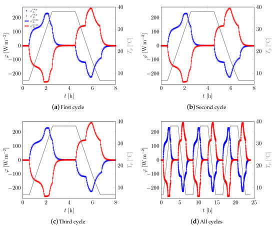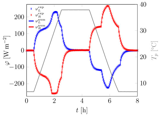 As mentioned hereinbefore, the starting point is the first cycle of the ramp for the 12.4-PCM mortar. The experimental heat flow-rates on the left and right sides of the sample for the given imposed temperature ramp are shown in Figure 5 with the corresponding numerical heat flow-rates obtained after the inversion process. One can see that agreement between the experimental measurements and the numerical computations is very good. Then, an obvious asymmetry is observed between each sides. This can be easily explained by the fact that, experimentally, the thermal contact is not perfect and is always different from one face to the other since their roughness is different. Consequently, huge variations can arise between these two sides. Yet, in spite of this asymmetry, the method is capable of reproducing the experimental behavior without any difficulties. Moreover, it is worth mentioning that the real sample also shows a non-symmetrical behavior between the melting and the crystallization steps, which is perfectly captured by the numerical calculation. This remark has to be further commented. First, this behavior is not due to the presence of supercooling, which would lead to a clear discontinuity during cooling, which is not observed experimentally. Added to this, it would be rather difficult for the results to represent such a phenomenon since it has not been considered during the modeling. In fact, this asymmetric feature is obtained only because the enthalpy function is governed by the relation (3), which shows a different behavior when going to the solid to liquid state and vice-versa. In other words, the slope of the function (and so its derivative) being non-constant, dynamics of the phase transition is different between melting and solidification. In this respect, this means that any enthalpy function having a symmetrical expression, as for instance with pure substances or solutions where a linear profile is assumed between the liquidus and the solidus, will no be capable to reproduce such a behavior. Once again, this is possible if and only if enthalpy function obeys Equation (3), as demonstrated in [68].