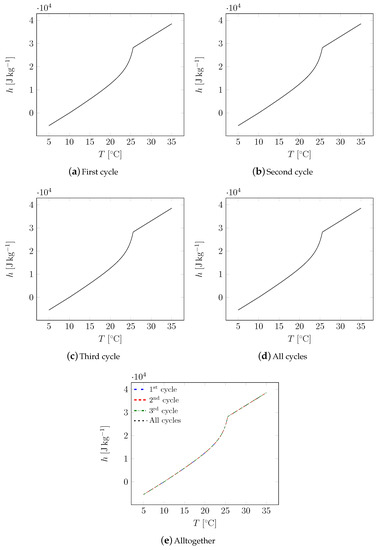 After this study for the first cycle, the purpose is extended to the other cycles of the ramp experiment. Thus, the second and third cycles are used as original inputs in the inversion process, as well as the entire set of cycles. The corresponding results are furnished in Figure 7. In all cases, the numerical results obtained with the present procedure show a very good agreement with the experimental data. Once again, both the non-equal thermal contact resistances at the left and right sides and the asymmetrical behavior between the fusion and solidification are perfectly rendered by the computations. Eventually, the enthalpy functions obtained after the inversion process are depicted in Figure 8. In Figure 8a–d the enthalpy functions obtained when using either the first or second or third or all cycles as original inputs are shown. Then, in Figure 8e, all these inverse results are compared with each other. On this latter one, it is worth noticing that the four estimated curves agree very well and cannot be distinguished from each other. From a practical point of view, this means that the cycle used for the inversion process is completely pointless. In other words, the method always permits to obtain the same results, i.e., an unique enthalpy function, whatever the original experimental measures used to initiate the seeds points of the inverse method. Undeniably, this is in complete agreement with thermodynamic laws.