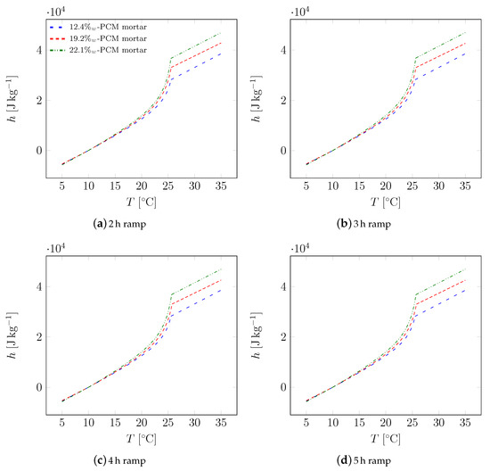 Thus, the enthalpy functions obtained after the inversion step are shown in Figure 9 and Figure 10, in function of the heating/cooling ramp and the type of mortar, respectively. In the first case, one can easily remark that, the higher the amount of PCM incorporated in the mortar, the higher the value of the latent heat. Practically, this increase is characterized by a larger phase change domain, situated between the two linear parts corresponding to the sensible states. Moreover, one can see that the beginning of this transition zone is almost the same for all mortars, whatever the heating rate that is used. In the second case, it is straightforward to notice that, for a given mortar, all the identified enthalpy functions collapse on a single curve. In other words, for all the heating rates and whatever the cycle that is used, or even if all of them are considered in the characterization process, the estimated enthalpy functions are not dependent on the heating ramp. In contrast with all the other existing methods, the present approach thus does not suffer from any non physical dependency of the enthalpy with the thermal stress. To further highlight this statement, the minimal and maximal and average values for all identified parameters are presented in Table 3 for each mortar. Concerning the thermodynamical parameters which are involved in the enthalpy relation (3), that is to say , , , , and , one can see that discrepancies are very low. Furthermore, when comparing the intensive parameters, that must not depend on the amount of PCM in the mortar, it is interesting to note that the maximum gap between the identified values is and for and , respectively, the associated deviation being 0.6% and 1.4%. In fact, these differences being of the order of the temperature uncertainty, one can conclude that all the numerical estimations coincide altogether. When looking at the other parameters, that vary with the amount of PCM, the comparisons can not be done anymore between all the mortars. Nonetheless, for a given mortar, the agreement between all the estimations is excellent.