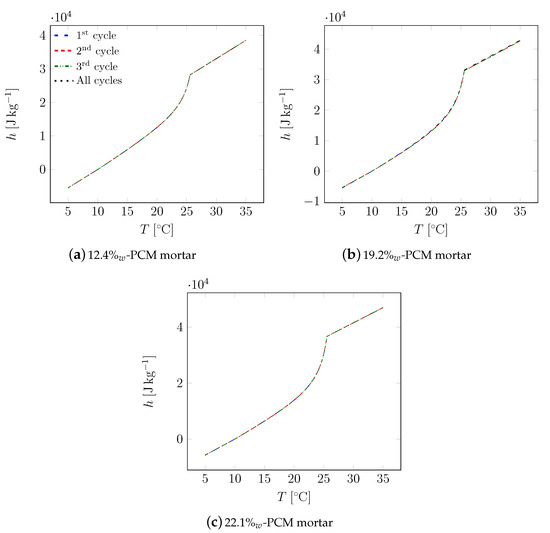 Concretely, the identification of the parameters is done simultaneously for each of the three cycles and then altogether with the inversion method. In order to thoroughly test the method, the studies are conducted on several melting/solidification cycles for three mortars incorporating different amounts of PCM. The results obtained show a very low dispersion, less than 3% and 4% for thermal conductivities and heat capacities, respectively, 2% (0.5K) for T, 3% for , and 4% for the complete enthalpy curve. These results are excellent considering the current standards, which are usually advanced as 1K for and 10% for [66,67]. Moreover, the masses of PCM integrated in the mortar as well as the speeds of thermal ramps do not affect the estimate of the transition temperatures, depending solely on the nature of the PCM which is similar from one sample to another. This independence is obviously in accordance with the laws of thermodynamics.