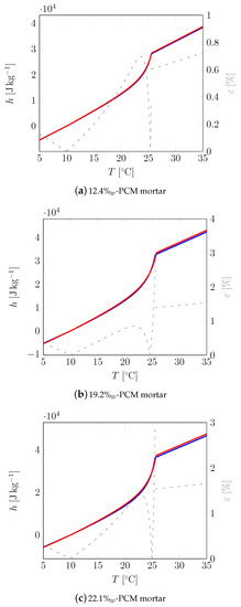 - The thermodynamic behavior of the PCM, i.e., its enthalpy function, obeys a binary solution model [68]:Here, the involved latent heat for the composite mortar depends on the mass fraction Y of the PCM included in this latter one: