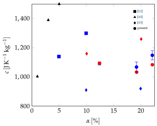Comparisons of the present estimations for the specific heat capacities for the solid (blue) and liquid (red) state with similar studies (black data mean that only an unique value has been given, without specifying the physical state (solid or liquid)).