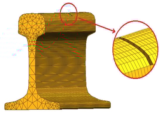 Firstly, the rail model with a railhead defect was established, and the excitation response of the rail was simulated using ANSYS. The rail was then excited by signals at a low center frequency of 200 Hz and a high center frequency of 60 kHz. The rail and defect models are shown in Figure 5.
