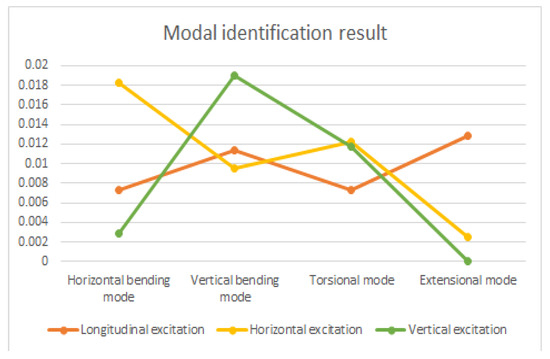 According to Figure 7, when the rail was excited longitudinally, the proportion of the extensional mode was higher. When the rail was excited horizontally, the proportions of the horizontal bending mode and torsion mode were higher. When the rail was excited vertically, the proportions of the vertical bending mode and torsion mode were higher.