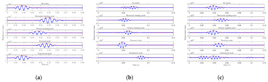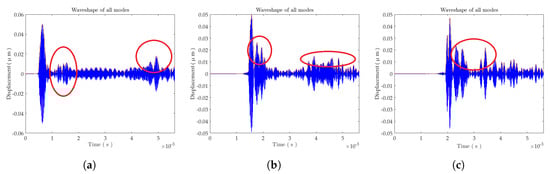 Acquisition waveforms for all modes with distances of: (a) 1.5 m; (b) 4.5 m; and (c) 6 m between excitation points and sampling points.