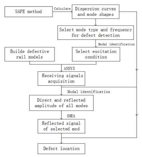 To locate rail cracks accurately by using ultrasonic guided waves, it is generally necessary to obtain a single mode propagating in the rail. The research ideas can be roughly divided into two kinds: one is to directly excite a single mode in the rail, and the other is to extract a single mode from the signal propagating in the rail. In previous studies, the research group proposed a single mode excitation method, which can excite a relatively pure single mode in rails [18]. At the same time, the group also carried out research on the optimal mode selection of rail crack detection in which a selection model of crack detection mode is created. For a specific crack, the guided wave frequency and mode suitable for crack detection are quickly selected. In this paper, a single mode extraction algorithm (SMEA) is proposed to ascertain the precise location of defects. The method is as follows: Firstly, the mode and frequency of defect detection are selected and a three-dimensional model of the defect present in the railhead is established. The simulation analysis is carried out using the three-dimensional finite element analysis software ANSYS. The defect models of the railhead are stimulated with low-frequency (200 Hz) and high-frequency (60 kHz) signals. The content of each mode of guided wave is quantitatively analyzed, and the position of the railhead defect is calculated according to the single mode extraction method. The semi-analytical finite element method and accurate modal identification method are described in Section 2. In Section 3, the SMEA and verification process are discussed. The defect location method and simulation results are described in Section 4. Conclusions are given in Section 5.