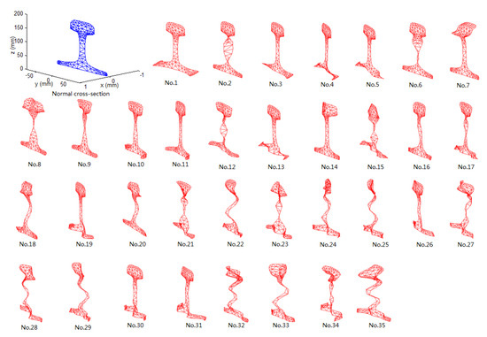 The detection frequency and mode were selected in the frequency range 20–70 kHz. According to Equation (5), the mode shapes of the rail in this frequency range were calculated and drawn. The frequency of 60 kHz was taken as an example, as shown in Figure 10. Among them, the modes in which only the railhead vibrated with almost no movement in the rail waist and rail bottom were modes No. 7 and No. 14.