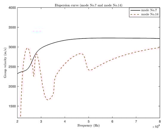 According to Figure 3b, the group velocity dispersion curves of modes No. 7 and No. 14 were extracted, as shown in Figure 11.