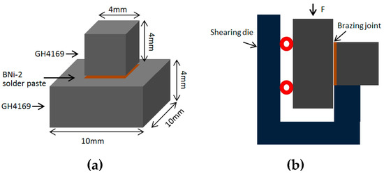 In this paper, GH4169 alloys (Liaoning Jinxin Special material Technology Co., Ltd., Liaoning, China) were used as base metals. A commercial BNi-2 solder paste (Shanghai Biaorui Welding Materials Co., Ltd., Shanghai, China) was used to braze a GH4169 base alloy. The chemical compositions of the base metal and BNi-2 solder paste are given in Table 1. GH4169 ingots were sectioned into 10 mm × 10 mm × 4 mm and 4mm × 4 mm × 4 mm coupons using an electro-discharge machine. In order to remove the oxide layer, the mating surfaces of the coupons were ground up to a 1200 mesh size and then ultrasonically cleaned in acetone for 30 min. The assembly forms of the base metals and interlayer are illustrated in Figure 1a. The bonding process was carried out at 1040–1100 °C for 30 min in a vacuum furnace (2 × 10−4 Pa). The samples were first heated to 600 °C at 10 °C/min and held for 20 min to homogenize the temperatures from surface to interior. The samples were then heated to the bonding temperature at 10 °C/min. After TLP bonding, samples were cooled down to room temperature at 5 °C/min.