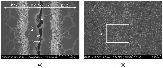 Figure 2b shows a magnified image of zone D. There are many fine particles in this region. EDS analysis showed that the Si in zone D was as high as 5.42 wt.%. According to Ni-Si-B phase diagrams [15,18], the solubility of Si in the γ-Ni solid solution was about 4 wt.% at room temperature. It can be preliminarily concluded that these fine particles were products of precipitation rather than a eutectic reaction. No nickel silicide was found in the ISZ, which can also be explained by the fact that Si in ISZ (~3.39 wt.%) was lower than the solubility of Si in the γ-Ni solid solution. It can be inferred that these fine particles were Ni3Si precipitates from the γ-Ni solid solution according to the Ni-Si phase diagram. These results were in agreement with previous work on the TLP bonding of duplex stainless steels [15,16]. It can be concluded that athermal solidification occurred during the cooling process. The formation of ASZ due to the bonding temperature was insufficient to complete isothermal solidification.