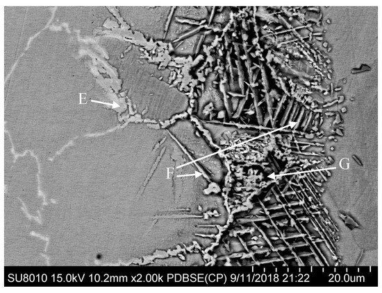 The SEM image of the DAZ of the GH4169 joint bonded at 1040 °C is shown in Figure 3. It can be seen that extensive blocky and needle-like compounds were formed in the DAZ. The EDS results of these compounds are shown in Table 3. The Cr, Nb, and Mo contents in zone E and zone F were significantly higher than those in the base metal, which confirms that the gray blocky and needle-like compounds were Cr-Nb-Mo-rich boride compounds. Similarly, The EDS results of zone G indicated that the black blocky compounds were Ni-Cr rich boride compounds. Although both B and Si are MPD elements, the silicon content in the DAZ was very low. Silicide is not clearly seen in Figure 3 due to the smaller atomic radius of B. During diffusion, B diffused into the interstitial site and Si would take the substitutional site so the diffusion rate of B was much higher than that of Si. It can also be seen that compounds were formed both in the grains and grain boundaries near the joint. However, compounds were formed only at the grain boundaries in the region far from the joint. This is because the free energy of the grain boundary is lower than that inside of the grain, and moreover, the concentration of B is relatively low in the farther region, according to diffusion theory. In conclusion, the formation of DAZ can be explained by the diffusion of B from the BNi-2 paste into the base metal, which reacted with the strong boride formers (e.g., Cr, Nb, and Mo) in the base metal.