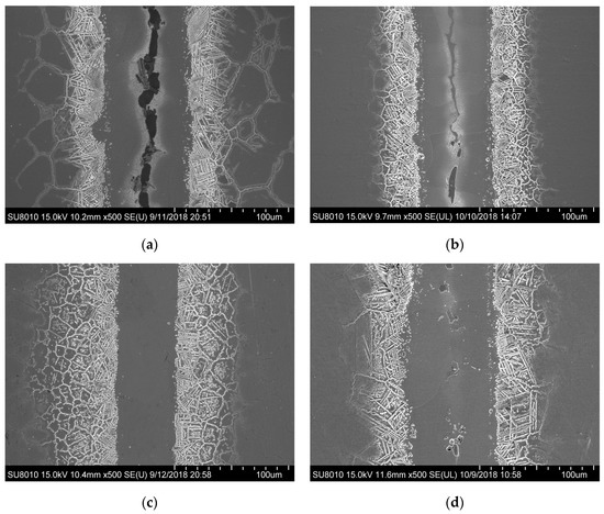 SEM images of TLP-bonded GH4169/BNi-2/GH4169 at different temperatures: (a) 1040 °C, (b) 1060 °C, (c) 1080 °C, and (d) 1100 °C.