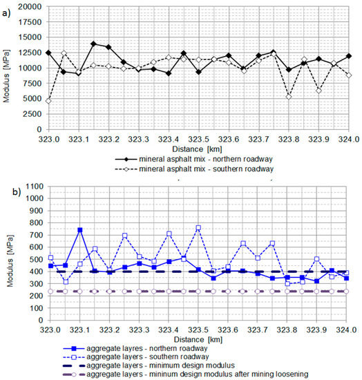 Detailed analysis of the values for the calculated pavement elastic modules indicated that the pavement and the subsoil were of high rigidity, which is in agreement with the assumptions made by Zornberg et al. [39] and Sudarsanan, et al. [40]. At the same time, in the section of increased deflections (i.e., from 323 + 800 km to 324 + 00 km—southern section), the value of modules was reduced. Whereas, the minimum modules did not exceed the minimum value, taking into account the loosening of the substrate with the mining deformations (Figure 13c).