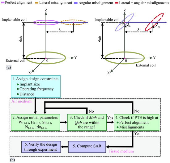 (a) Orientation of the external and implantable coils; (b) Flowchart of the optimization procedure of a 3-coil inductive link.