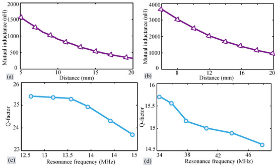 (a) Mutual inductance vs. distance between the coils at 13.56 MHz; (b) Mutual inductance vs. distance between the coils at 40.68 MHz; Q-factor vs. resonance frequency at (c) 13.56 MHz operating frequency; (d) 40.68 MHz operating frequency.