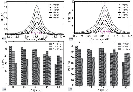 (a) PTE vs. frequency vs. distance at 13.56 MHz; (b) PTE vs. frequency vs. distance at 40.68 MHz; PTE vs. alignment configurations at (c) 13.56 MHz; (d) 40.68 MHz.