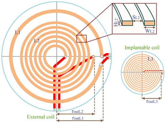 - Mutashar, S.; Hannan, M.A.; Samad, S.A.; Hussain, A. Design of spiral circular coils in wet and dry tissue for bio-implanted micro-system applications. Prog. Electromagn. Res. 2013, 32, 181–200. [Google Scholar] [CrossRef]
