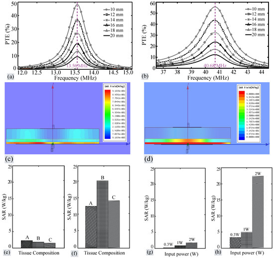 To analyze the effects of input power on SAR, in addition to 1 W, the system is also simulated with input powers of 0.3 W and 2 W at 13.56 MHz and 40.68 MHz. Figure 7g,h depicts the change in SAR value with respect to the input power at 13.56 MHz and 40.68 MHz respectively. From Figure 7g,h, the analysis shows that the SAR value increases with increase in input power. For an input power of less than 2 W, the SAR produced is below the limit set by FCC at 13.56 MHz, but, at 40.68 MHz, the SAR exceeds the limit set by FCC for a low input power of 0.3 W.