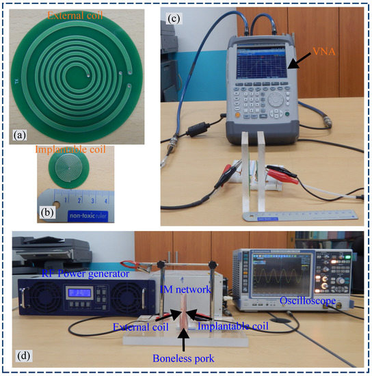 Fabrication of (a) External coil; (b) Implantable coil; (c) Experimental setup for measuring the PTE; (d) Experimental setup for measuring the PDL.