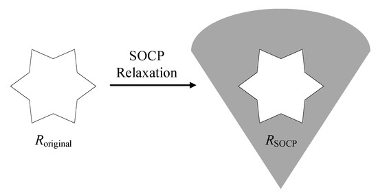 Here, a brief description of the SOCP relaxation process is shown in Figure 1. is assumed to be the nonconvex feasible region of the original model. SOCP relaxation is used to enlarge the original feasible region to a convex set . It is obvious that contains . If the optimal solution S exactly lies in , the SOCR is strict and S is also the optimal solution of the original model [36,37].