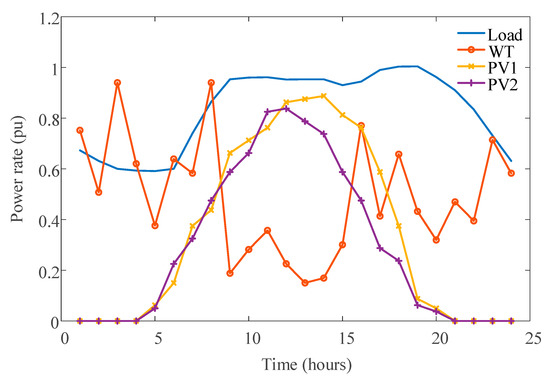 The 33-bus distribution network is shown in Figure 2. The initial load is used as the base load. Parameters of DGs are given in Table 1 and ESSs are given in Table 2. The inverter capacity of WT, PV, and MT is 1.05 times of the rated power. The ramp rate of MT is 150 kW/h. Two CBs are connected to bus 8 and bus 13, whose capacity are both [0, 0.5] MVar with a step size of 0.05 MVar. An SVG with a capacity of [−0.1, 0.4] MVar is located at bus 30. The adjustment step of OLTC is 0.01 and the switchable range is [0.94, 1.06] pu. The initial storage capacity of ESS I and ESS II are 200 kW and 100 kW, respectively. Moreover, the state of charge (SOC) is always between 20% and 90% to extend the battery life. The time-of-use electricity price is shown in Table 3. The price of power loss is 0.68 ¥/kWh, while the operation and maintenance cost of MT and ESS are 0.38 ¥/kWh and 0.05 ¥/kWh, respectively. Figure 3 depicts the forecast data of the load [39] and the WT and PV power output (percentages of corresponding rated power). The forecast errors of WT and PV are assumed to be 10% of the mean value. By using the MCS and the backward scenario reduction technique, 20 representative scenarios are finally produced in this paper.