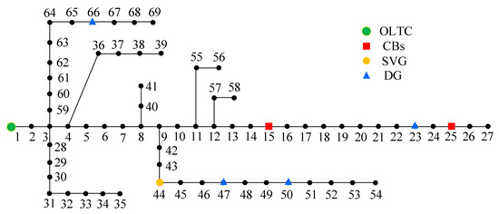 For the 69-bus system, as shown in Figure 4, MT, WT, PV1, and PV2 are connected to buses 23, 47, 50, and 66, respectively. An SVG is located at bus 44. Two CBs are connected to buses 15 and 25. The parameters of DG, CBs, SVG, and ESS are the same as those in the 33-bus distribution network.