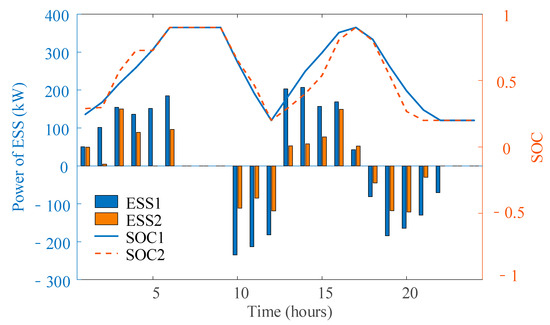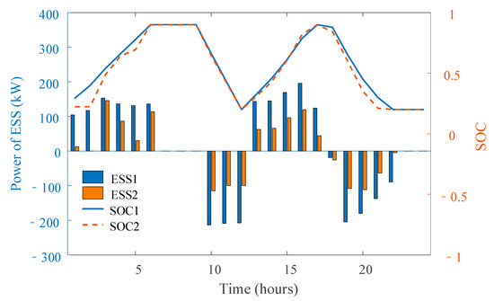 The optimized dispatch results of ESSs for the 33- and 69-bus distribution networks are shown in Figure 5 and Figure 6, respectively. The ESSs charge energy from the network during the valley and flat periods when the electricity prices are low (e.g., t = 1–6 and t = 13–17), and release the stored power to support the network during peak periods (e.g., t = 10–12 and t = 18–22), which indicates that ESSs are able to reduce the operation cost by shifting some load to valley periods. In addition, the SOC of the ESSs is always between 20% and 90% so as to extend the battery life and the final state of ESSs are equal to the initial state in a day.