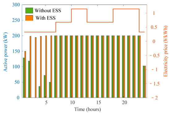 Comparison of MT output with and without ESS for 33-bus distribution network is shown in Figure 7. As can be seen from the figure, during the peak period and flat period, the electricity price of the main grid is higher than the generation cost of MT. So, it is reasonable that MT generates maximum output to decrease the purchase cost from the main grid. It is worth noting that in valley periods when the cost of MT power generation is a little higher than the electricity price of the main grid, the MT still has a certain output. The reason is analyzed as follows. Due to the large R/X ratio of distribution systems, the active power scheduling affects the power losses as well. MT can help the network run more economically through reducing the network power losses, though the cost of MT power generation is slightly higher. In addition, the comparison between with ESS and without ESS indicates that the MT can cooperate with ESS to further reduce the operation cost of ADN, resulting in more MT output in valley times.