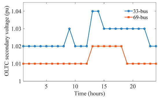 Figure 8 shows the optimized hourly dispatch results of OLTC for the two distribution networks. It can be clearly seen that the constraints of OLTC action times are satisfied.