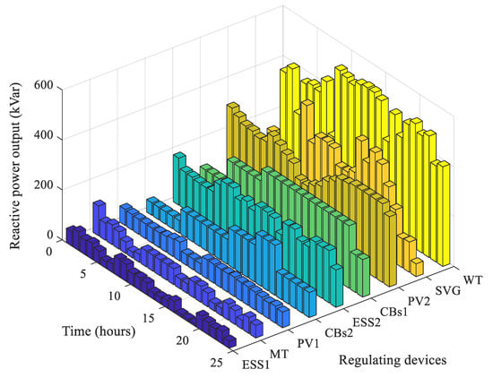 The results of different reactive power-regulating devices for 33-bus distribution network are shown in Figure 9. It is easy to see that the reactive power outputs of all the devices are within respective output limits, and the constraints of action time of CBs are satisfied. Note that the reactive power outputs of PV2 and WT are opposite to their active power due to the limit of the inverter capacity, while the reactive power output of PV1 still has a certain regulation range, which will enhance its ability to deal with system uncertainties.