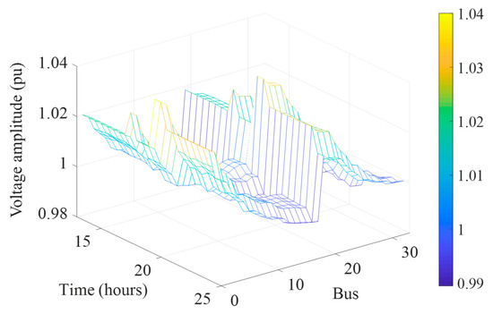 The detailed results before and after the coordinated optimization are indicated in Table 4. It can be calculated that for the 33-bus distribution network, the power losses, the total operation cost and the voltage deviation are decreased by 57.10%, 7.27%, and 75.34%, respectively. For the 69-bus distribution network, the power losses, the total operation cost, and the voltage deviation are decreased by 46.98%, 6.87%, and 47.32%, respectively. The curves of bus voltage amplitude of 33- and 69-bus distribution networks after optimization are shown in Figure 10 and Figure 11, respectively. It is clear that the voltage constraints of all the buses are satisfied and the voltage level is significantly improved.