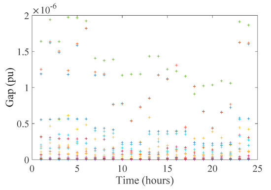 The gaps of all branches of the 69-bus distribution network during 24 h are shown in Figure 12. It is obvious that the order of magnitude of all the gaps is 10−6, which implies that the conic relaxation is actually exact to the original nonconvex model. Thus, the accuracy of SOCP relaxation is verified.