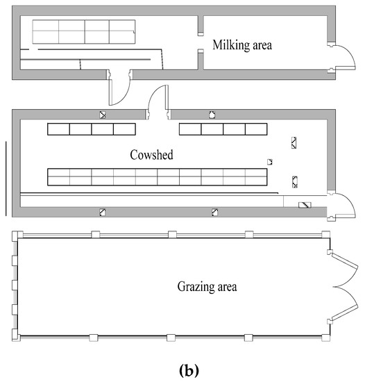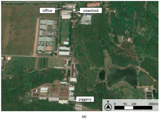 (a) The aerial photo of livestock farm; (b) The floor plan of dairy farm.