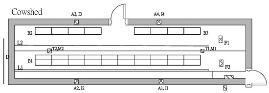 The floor plan of experimental device in dairy housing. Where A is wind speed sensors (A1,A2,A3,A4), F is fans (F1,F2,… F14), I represents illuminance sensors (I1,I2,I3,I4), M denotes the humidity sensors (M1,M2), T is temperature sensors (T1,T2), D denotes distribution box.