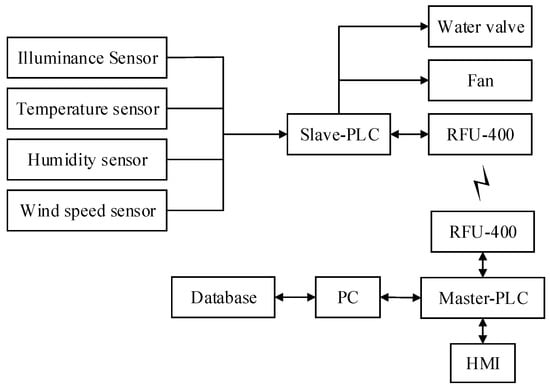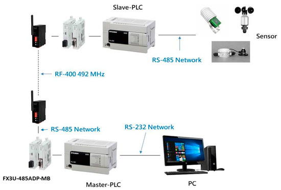 A wireless communication network was then established through the RFU-400CR wireless transceiver. The Master/Slave communication between devices were connected by using the Modbus communication protocol, and the commands were sent by the Master to have the Slave to transmit the data retrieved by PLC from sensors back to the Master. The livestock administrator could observe the environmental data in the barns at a remote terminal. The setting method was as follows: The Modbus station numbers of Master and Slave, communication settings, and packet latency could be set in the PLC program, and the data collected from different sensors were stored in the PLC register by using the “ADPRW” command [26] and then the signal could be smoothly transmitted to the register of the PLC.