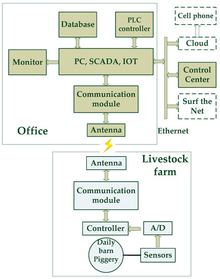 Livestock farms are often located in sparsely populated remote areas. Due to the environmental considerations such as high cost, difficulty in erecting power lines, or signal attenuation caused by long lines, it’s not possible to widely apply wired remote data transmission. Therefore, this study has applied radio frequency (RF) technology for remote wireless data transmission and remote control for monitoring the environment parameters of livestock farms. The signal transmitters emit electromagnetic waves through the antennas, and the signal receiver side can receive the messages through the receivers and demodulation process.