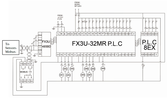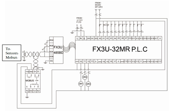 - Mitsubishi CO., LTD.v. FX3S·FX3G·FX3GC·FX3U·FX3UC Series User Manual [MODBUS Communication]; Mitsubishi Electric Corporation: Tokyo, Japan, 2014; pp. 87–113. [Google Scholar]