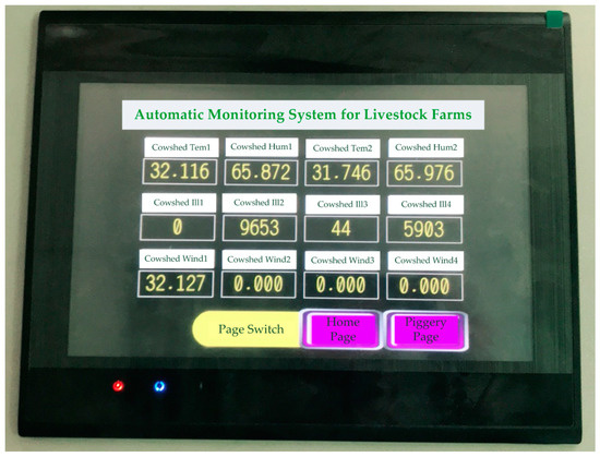 After the data were collected to the PLC’s designated register, the MX sheet package was used to set up the data retrieving time and lengths to retrieve the required data and export the retrieved data into an Excel file database for the researchers’ computation and analysis purposes. Meanwhile, the human-machine interface also retrieved the data from the register, and the data from different sensors were displayed in the human-machine interface for observation by staffs in the livestock farm, as shown in Figure 9.