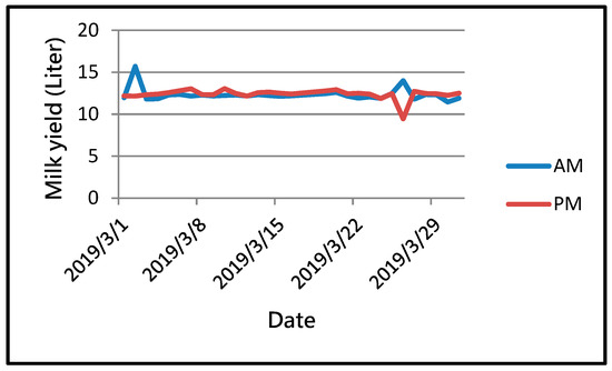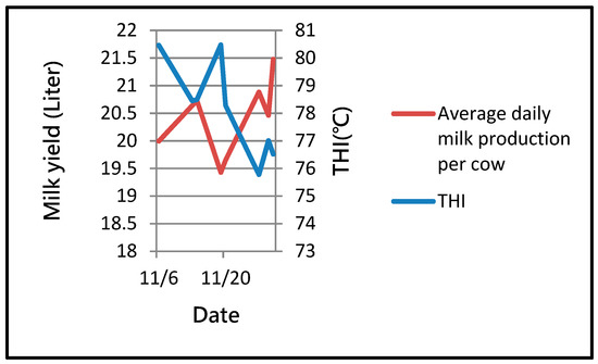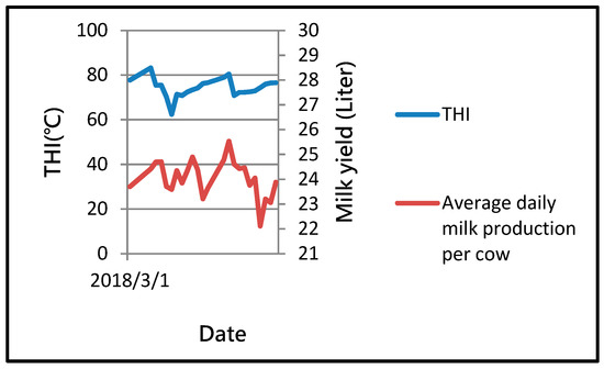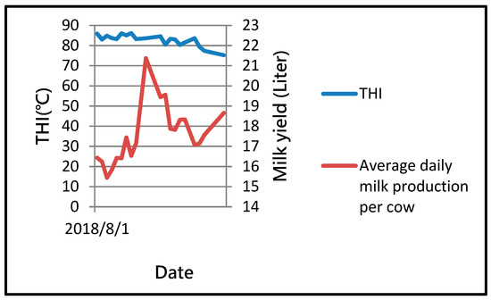 Comparing Figure 10, it indicated that there was only one time that it reached the degree of moderate heat stress, resulting in a 0.4887 L/day reduction of average lactation yield per dairy cow. Furthermore, a strike of three-day cold current also caused a 1.0273 L/day reduction of average lactation yield per dairy cow due to a sudden environmental temperature change. It was found that a one-day heat stress showed little impact on the lactation yield, but the heat stress over a longer period showed significant impact on the lactation yield of dairy cows.